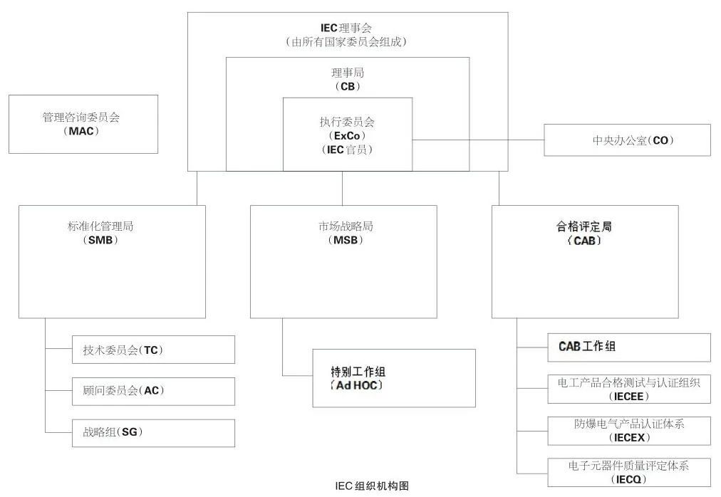 根据IEC章程和议事规则的规定,IEC的主要机构有理事会(全体大会)、理事局、执行委员会、管理咨询委员会、标准化管理局、合格评定局、市场战略局、中央办公室等。