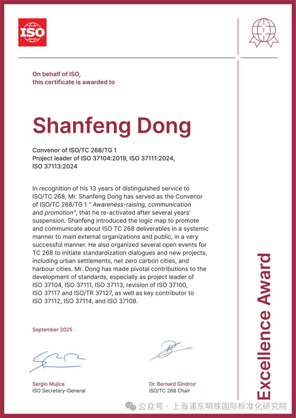 10月24日,国际标准化组织(ISO)正式授予上海浦东明珠国际标准化研究院院长董山峰先生“ISO卓越贡献奖”(ISO Excellence Award)。这一被誉为国际标准界的权威荣誉,是对其十余年来深耕城市可持续发展国际标准化领域,以卓越领导力推动全球标准体系建设的高度认可,也标志着我国在国际标准化人才培养和智慧城市与可持续社区标准领域的技术实力、国际影响力获得世界公认。