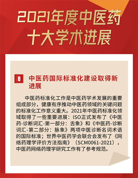 中医药标准化工作是中医药学术发展的重要组成部分,健康有序推动中医药领域的关键问题的标准化工作意义重大。2021年,上海中医药大学主导制定的《中医药-诊断词汇-第一部分:舌象》和《中医药-诊断词汇-第二部分:脉象》两项中医诊断名词术语ISO国际标准正式发布。这两项标准的发布是国际标准化组织中医药技术委员会(ISO/TC 249)首次出版中医诊断学术语标准,为国际范围内规范和统一中医诊断学名词术语提供了重要依据,此次入选2021年度中医药十大学术进展。