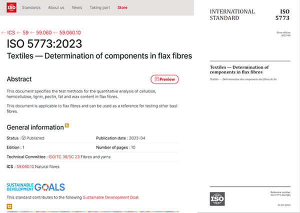 此次正式发布的ISO国际标准《纺织品 亚麻纤维组成成分的检测方法》是我国自主研发的方法标准,标准规定了亚麻纤维中纤维素、半纤维素、木质素、果胶质、脂蜡质等化学成分的定量分析方法,为纺纱各个生产环节中的麻纤维质量管控提供了有效的检测手段。该标准填补了目前国内外相关测试方法标准的空白,为亚麻纤维组成成分含量测试提供国际上统一的标准,为其原料分析与纺织加工质量的控制提供了重要的评估手段和依据,对于规范国际市场的亚麻纤维贸易和指导企业的原料采购与生产加工具有重要意义。