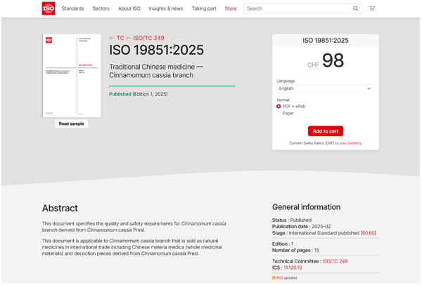 ISO19851: 2025 Traditional Chinese medicine—Cinnamomum cassia branch《中医药—桂枝》国际标准由国际标准化组织(ISO)近期正式发布,这是上海中医药大学中药学院张彤教授研究团队主导制定与发布的大宗中药材ISO国际标准。