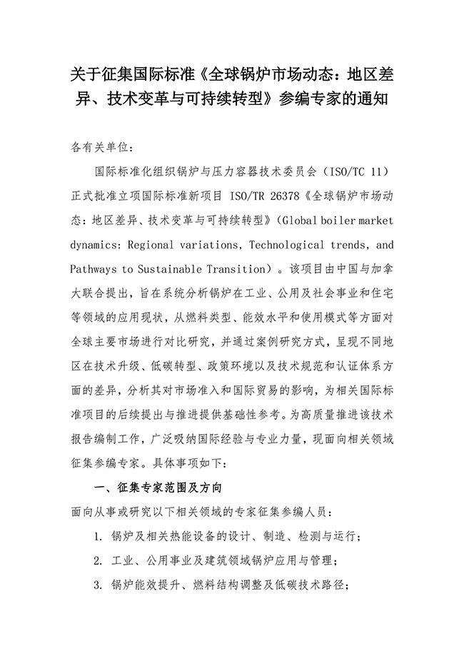 关于征集国际标准《全球锅炉市场动态:地区差异、技术变革与可持续转型》参编专家的通知