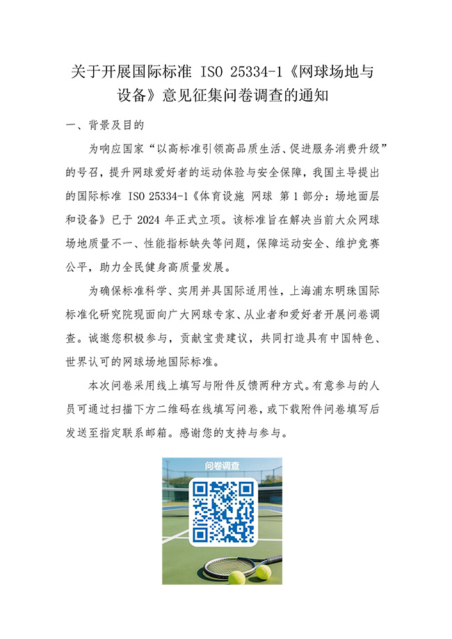 关于开展国际标准 ISO 25334-1《网球场地与设备》意见征集问卷调查的通知